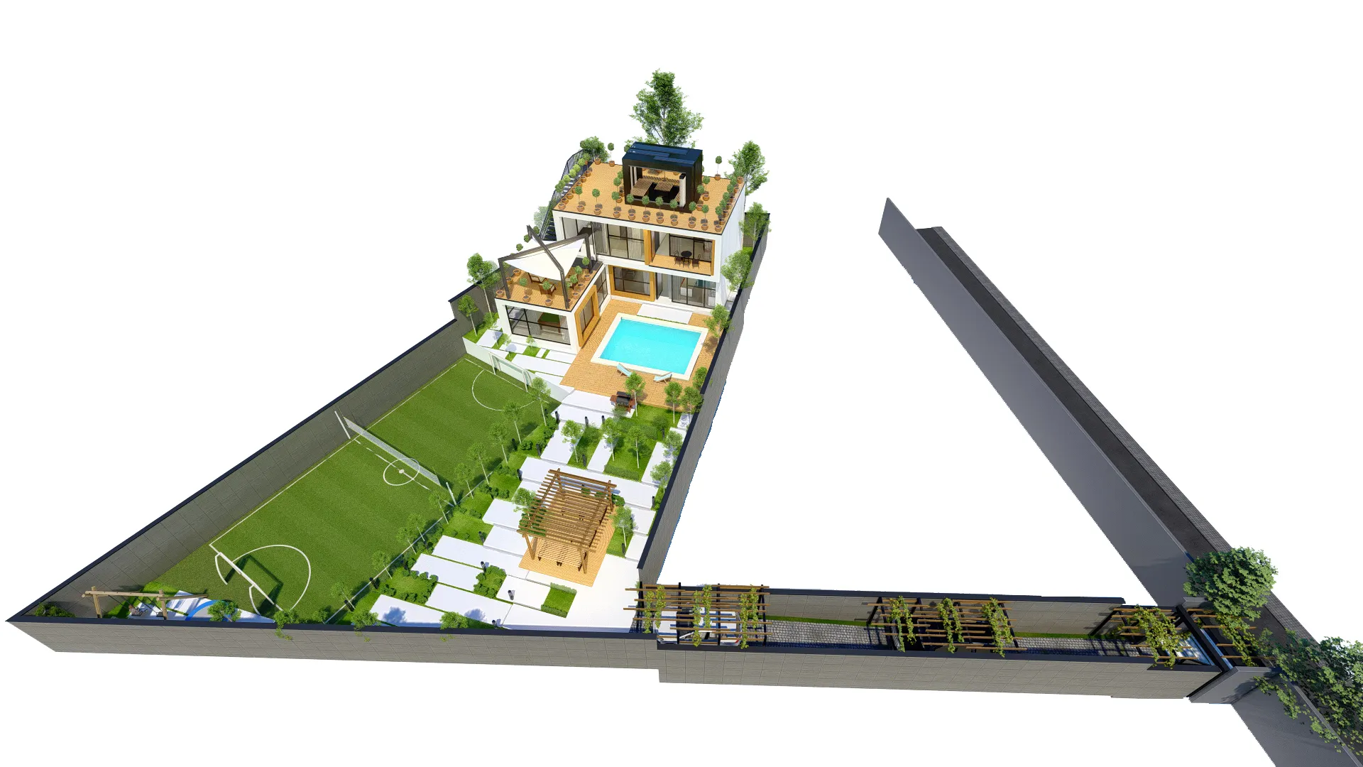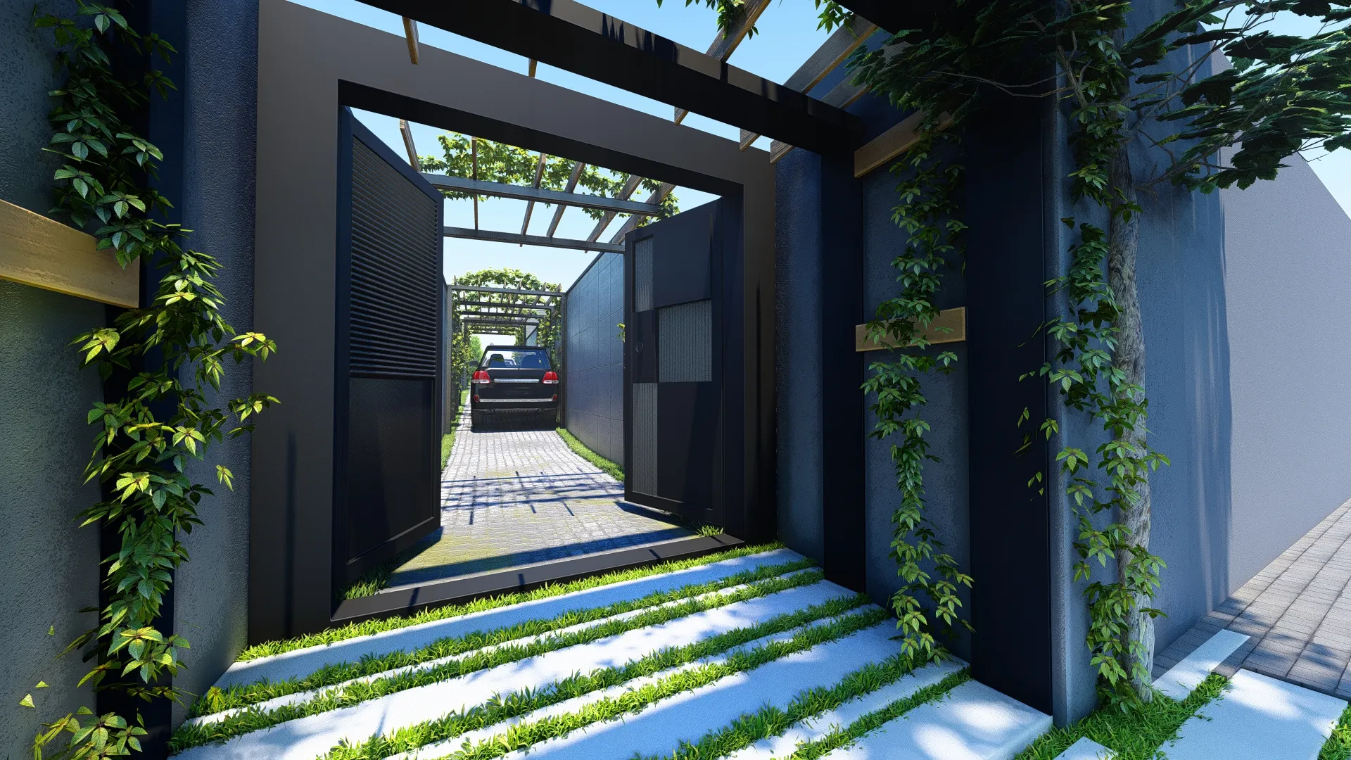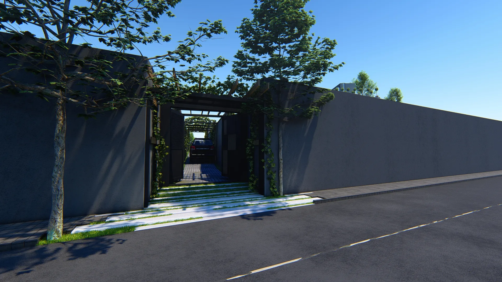 آلترناتیو 2 شامل: طراحی حجم و نمای ویلا و طراحی منظر و طراحی سر در و پارکینگ ورودی