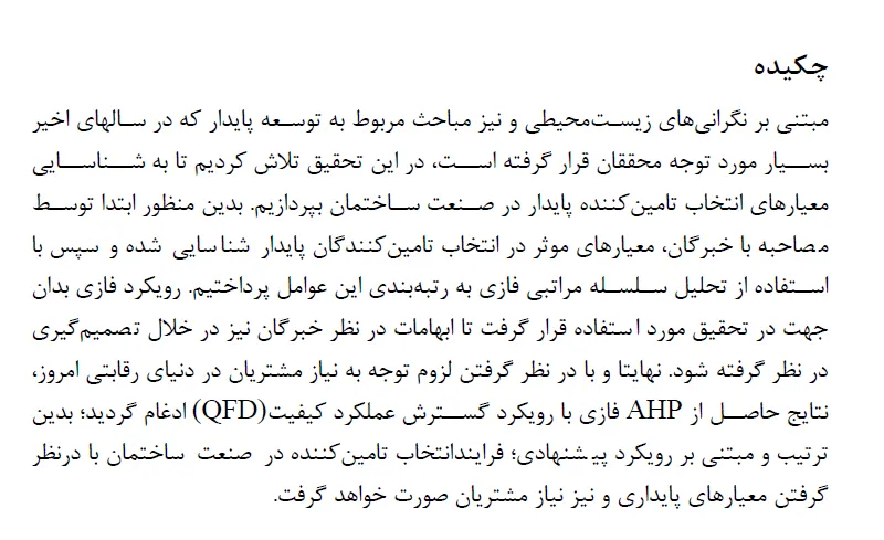 شناسایی و رتبه بندی عوامل انتخاب تامین کنندۀ پایدار و ارزیابی تامین کنندگان با استفاده از رویکرد تلفیقی QFD و AHP فازی در صنعت ساختمان سازی