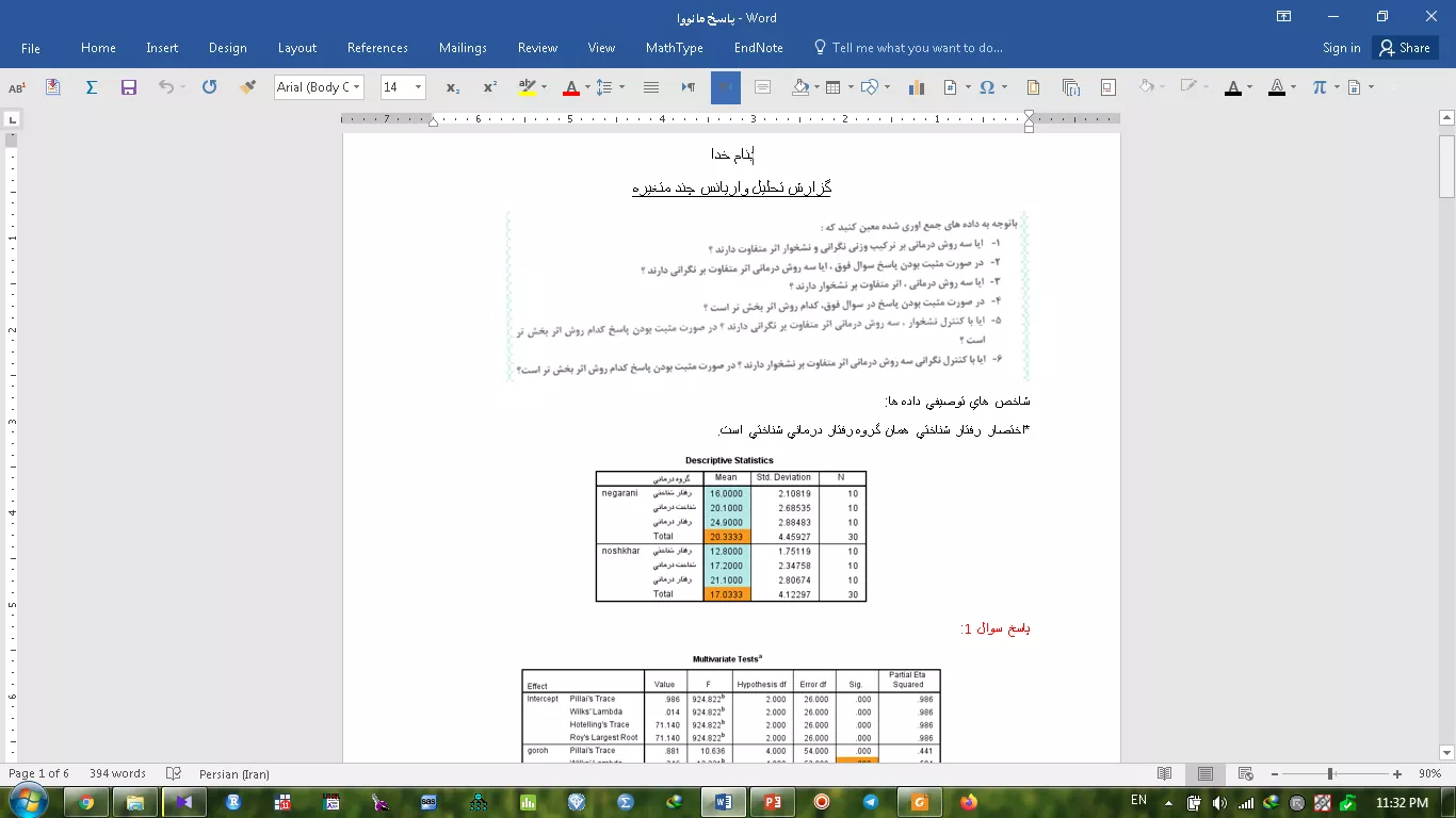 در اين پروژه از تحليل واريانس چند متغيره يا مانووا براي بررسي فاکتورهاي روانشناختي استفاده نموديم و گزارش کاملي از نتايج تحليل را ارايه داديم.